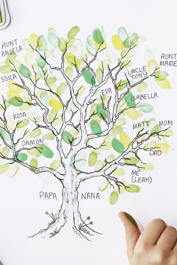 Une a la familia a través de un proyecto genealógico práctico. Haz un tronco con lápiz y dile a tu hijo que le agregue las hojitas al árbol con las huellas de sus dedos.